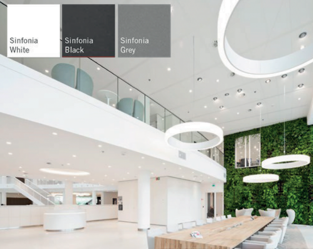 Sinfonia ceiling panels come in three great colours giving you great acoustics with design options With more and more buildings being designed as open plan, the need for premium acoustics has become increasingly apparent with architects and developers alike. With OWA’s complete range of ceiling panels and suspension systems, we can cater for all your aesthetic and practical needs.