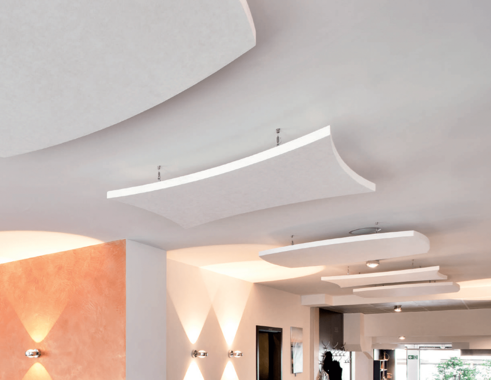 The canopies Curve 1 (concav) and Curve 2 (convex) are white, fleece-covered, glasswool-based ceiling canopy modules and therefore a real lightweight on the ceiling. Even the edges are white and finished so that the individual modules can be hung alone or arranged in formations. Huge acoustic bonus: Curve 1 is an A-class absorber (sound absorption value 1). The nearly square 1200 x 1100 mm concave-shaped module can be covered with coloured fabric. This opens new design options for the ceiling.
